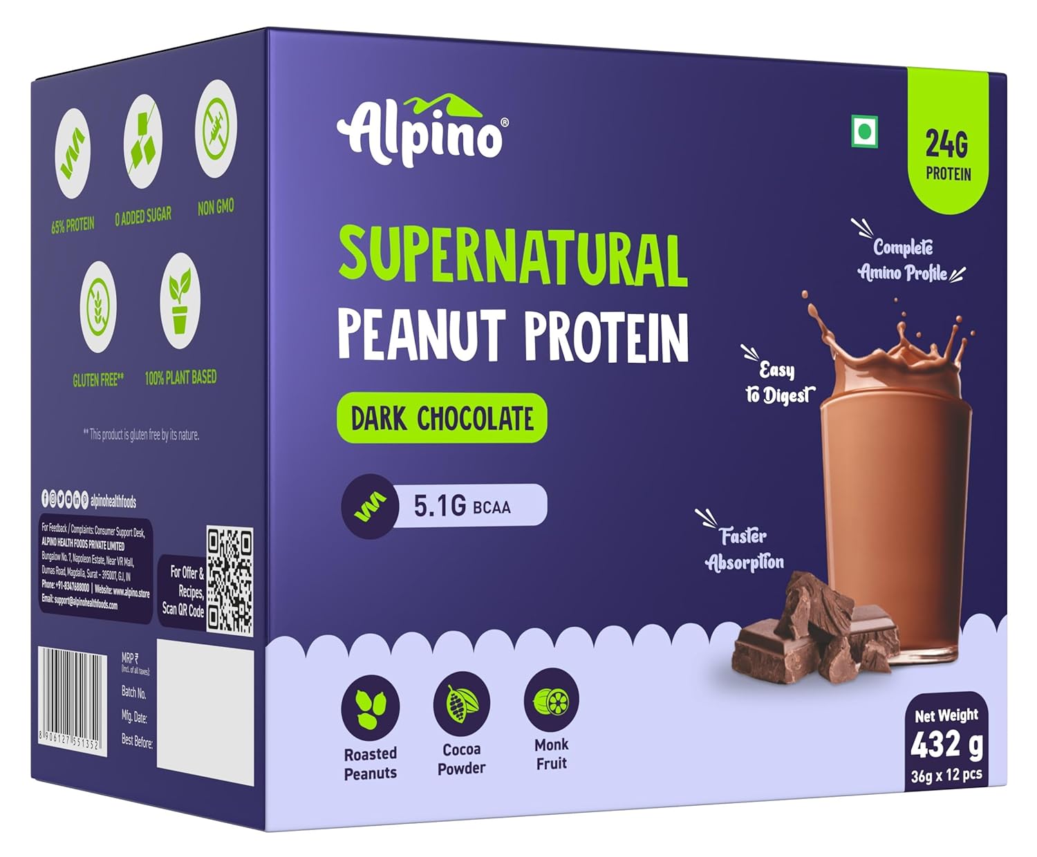 ALPINO Supernatural Peanut Protein Powder Dark Chocolate 432g (36g x Pack of 12) – Roasted Peanuts, Cocoa Powder & Monk Fruit – 24g Protein, 5.1g BCAAs, No Added Sugar – World’s First Peanut Protein Isolate