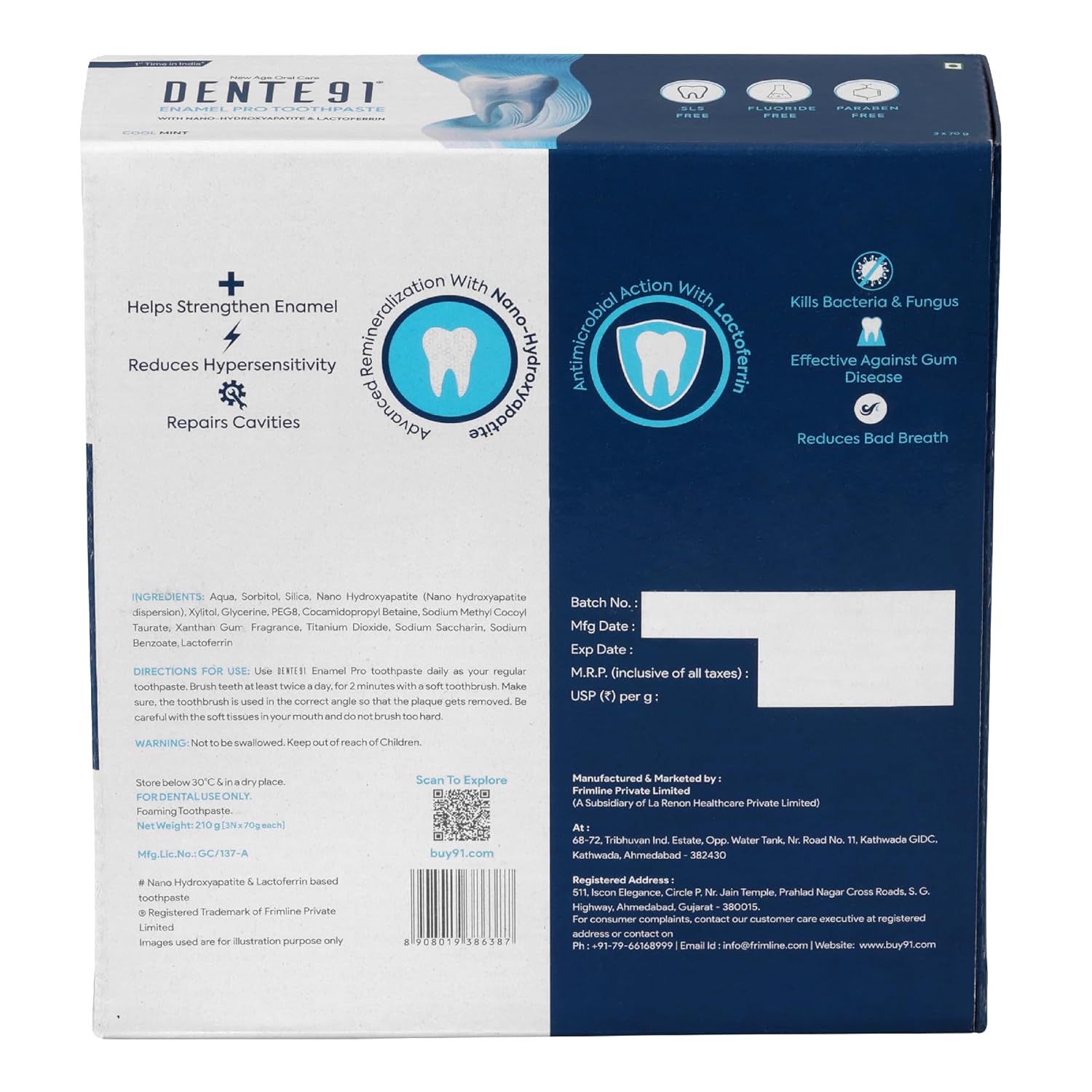 Dente91 Enamel Pro Toothpaste | Sensitivity Relief | Repairs Cavities | Fights Gum Disease | Reduces Bad Breath | Strengthens Enamel | Pack of 3, 3 X 70g