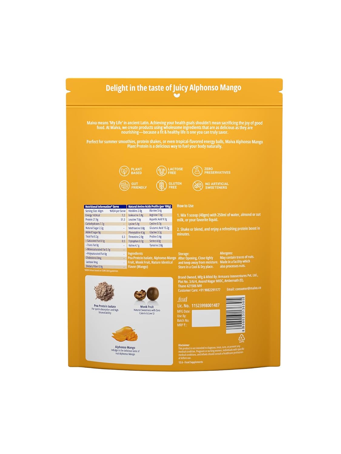 Maiva Pro | Plant Protein Isolate – Alphonso Mango – 1kg | 28g Protein, 6g BCAA | All Essential Amino Acids | Gut Friendly, Easy to Digest | Vegan, Dairy Free, No Preservatives