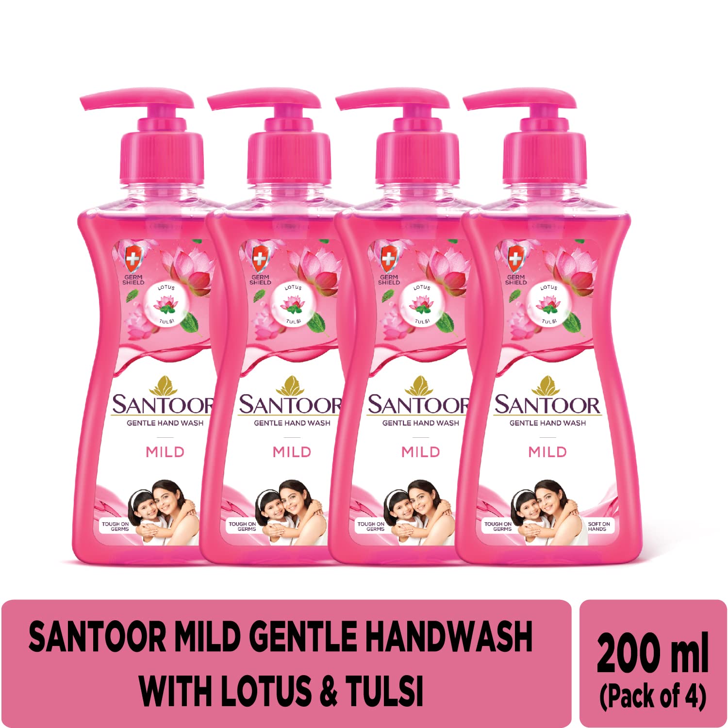 Santoor Mild Gentle Hand Wash 200ml, Pack of 4 with Goodness of Lotus & Tulsi| Rich Lathering Formula with Anti-Bacterial Properties| Soft on Hands| Soothes & Hydrates Skin