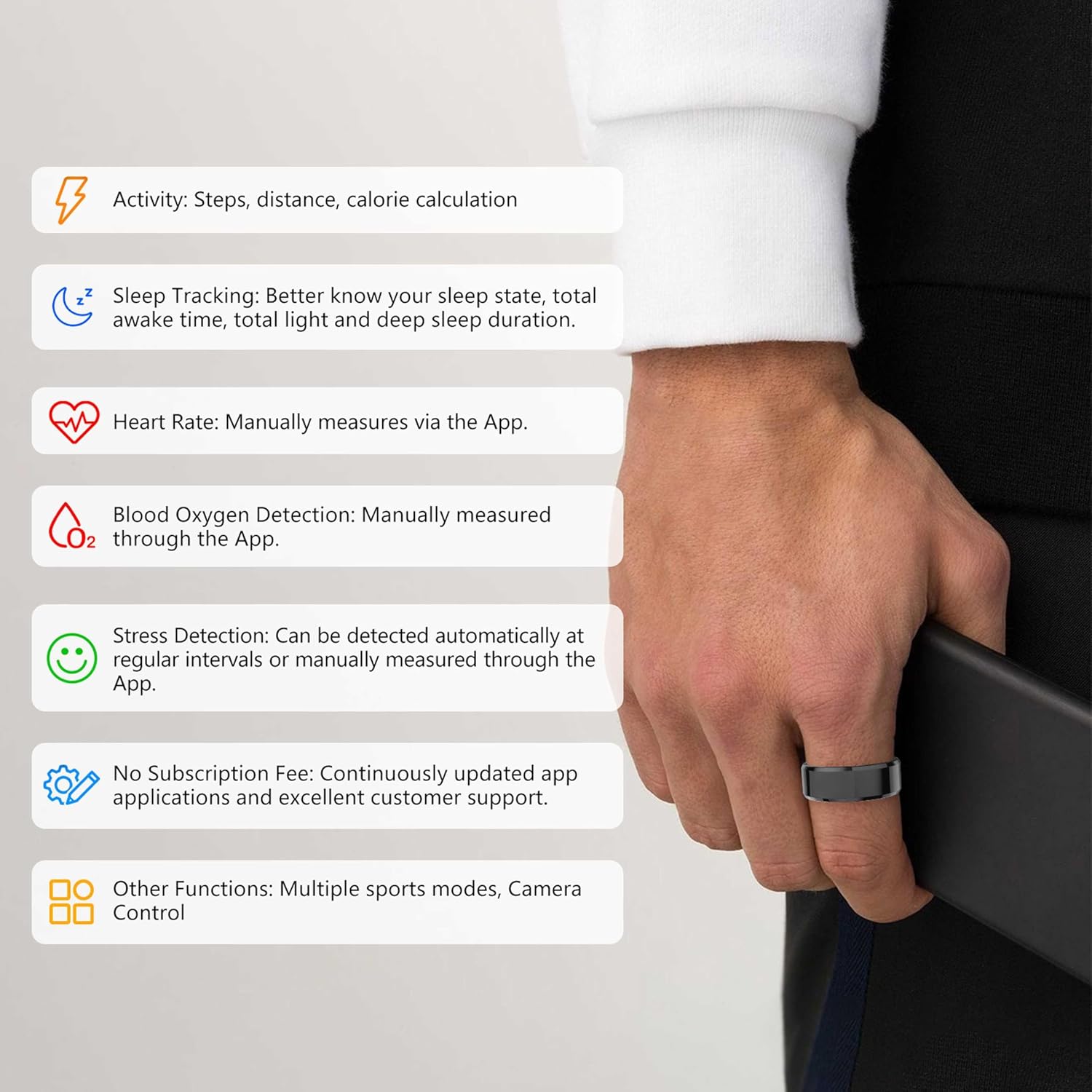 Fitness Tracker Smart Ring, Step Counter for Walking, Heart Rate Blood Oxygen Calorie Sleep Tracker Health Ring, IP68 Waterproof Design, Stainless Steel, 5-7 Days Battery Life(Black, US12)