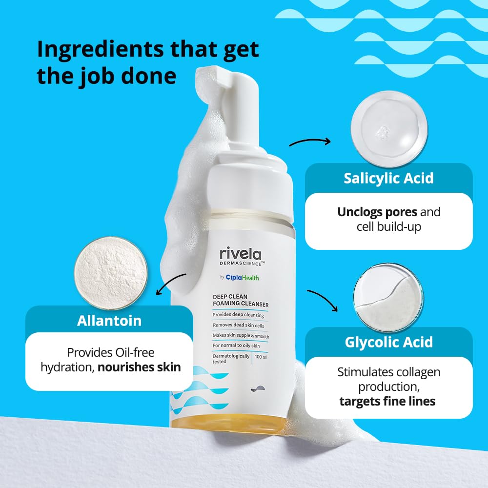 Rivela Dermascience Deep Clean Foaming Facial Cleanser By Cipla | Removes Dead Skin Cells | Makes Skin Supple and Smooth | For Normal to Oily Skin | 100 ml