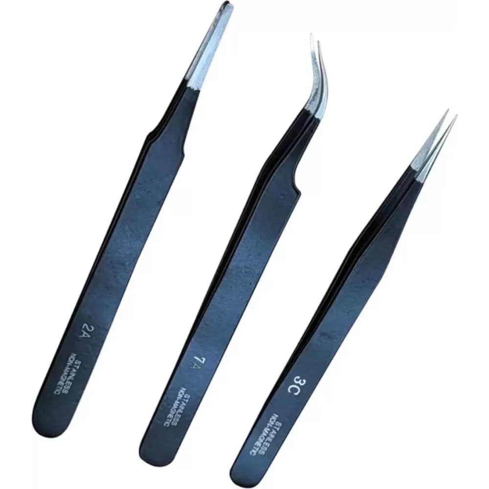 Alis Professional Stainless Steel Tweezers Set – 3 Pieces Combo Set | Great Precision for Facial Hair, Eyebrows Extensions, Ingrown Hair, Splinter, Blackhead, Nose Hair Remover (Black)