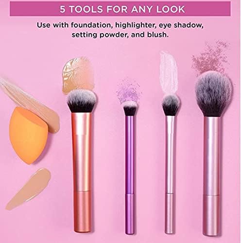 Everyday Essentials 5-Piece Makeup Brush Set with Miracle Complexion Sponge – For Foundation, Blush, Highlighter & Concealer – Synthetic Bristles, Travel-Friendly