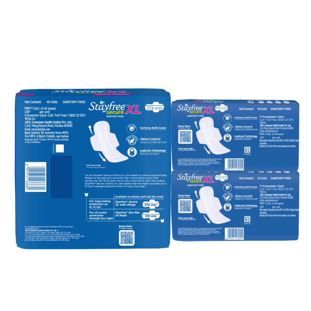 Stayfree Secure xl | Combo packs 98 Pads | Cottony Soft Sanitary Pads for Women | with Leak Lock Technology | Odour Control | Absorbs Up to 100% fluid | Up to 12 Hours of Protection |