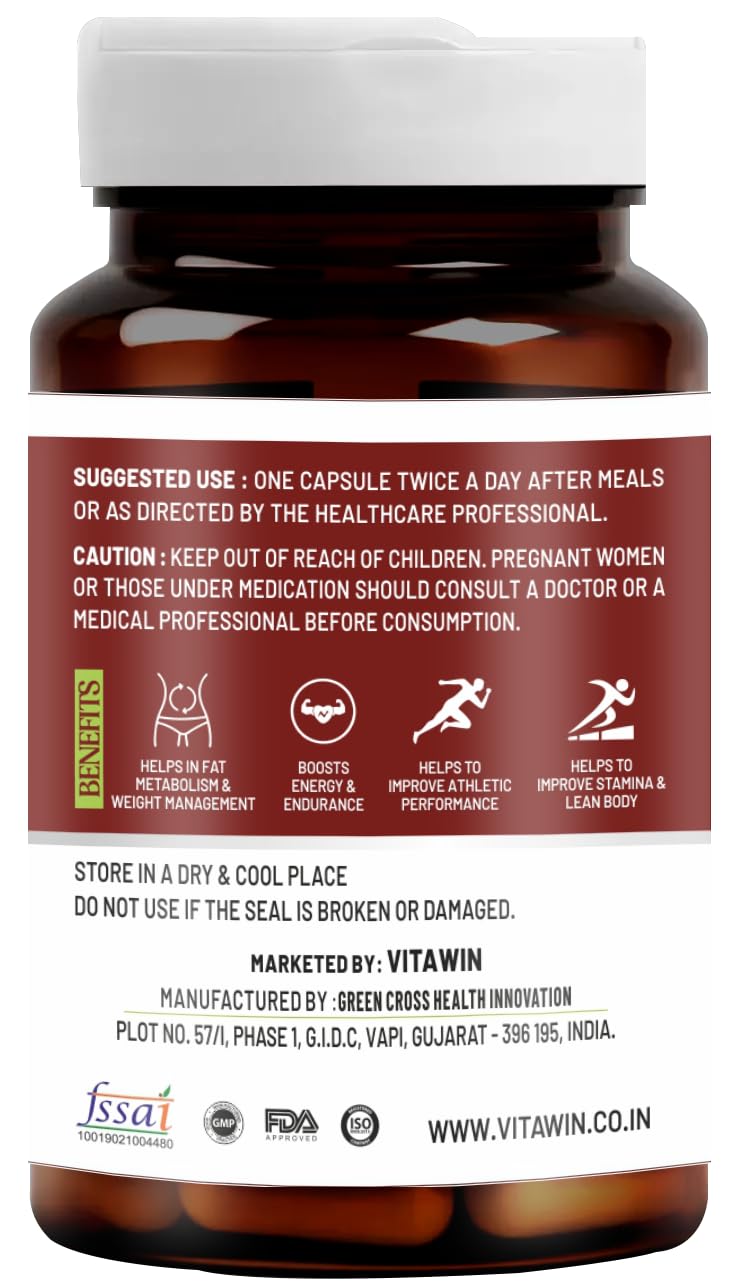 VitaWin L-Carnitine For Fat Loss, Stamina & Recovery, Natural Herbal, 500 mg, Veg – 60 Capsules Nutrition Supplement