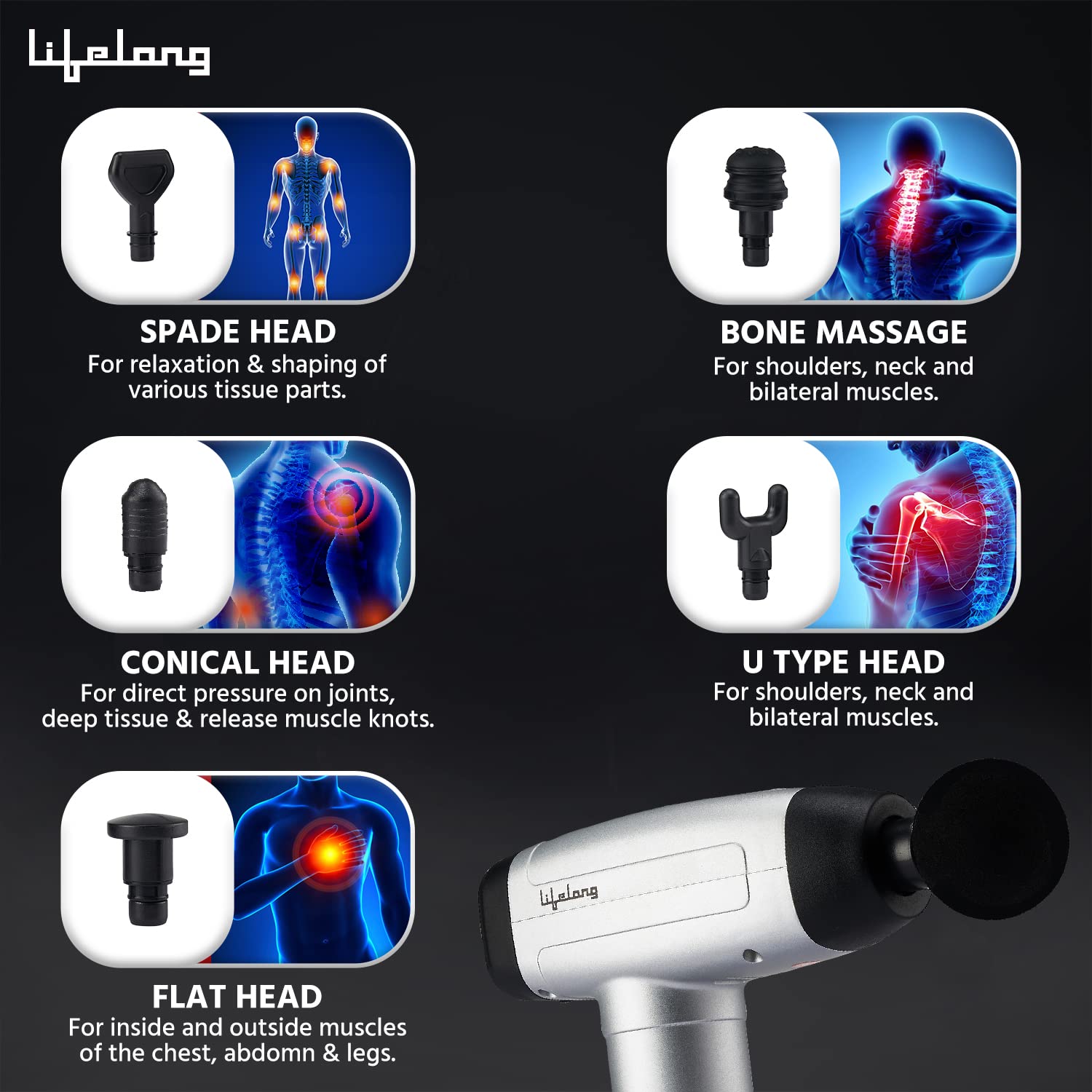 Lifelong Gun Massager Deep Tissue Full Body Massage Machine For Pain Relief & LLGM09 Gun Massager Deep Tissue Full Body Massage Machine For Pain Relief, 30 Speed Level Massager Machine, Silver