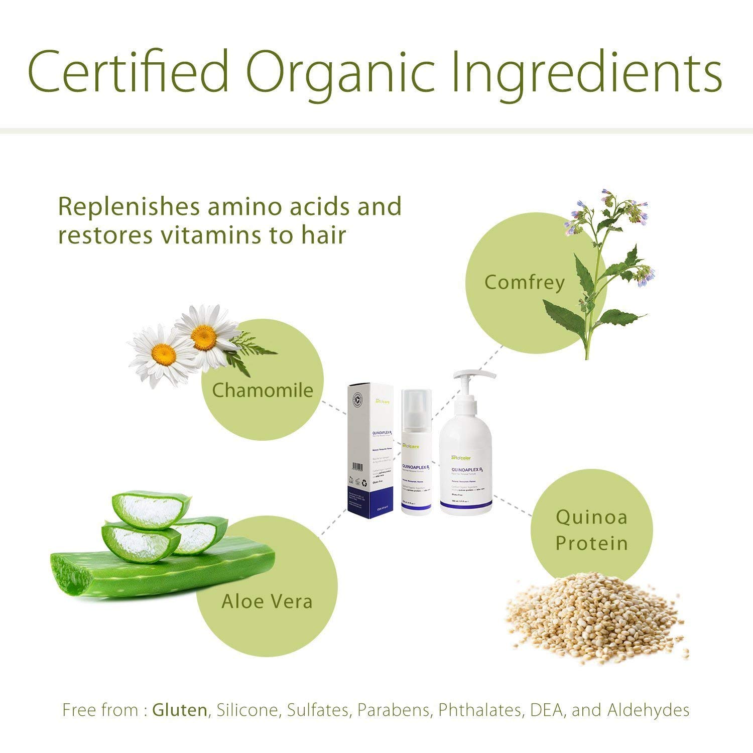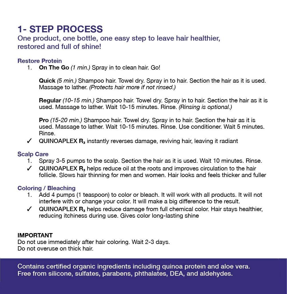 During coloring or bleaching, QUINOAPLEX R3 can be added to mixture to prevent hair dehydration and damage Protects scalp Improves color retention and shine Certififed organic ingredients including quinoa protein and aloe vera