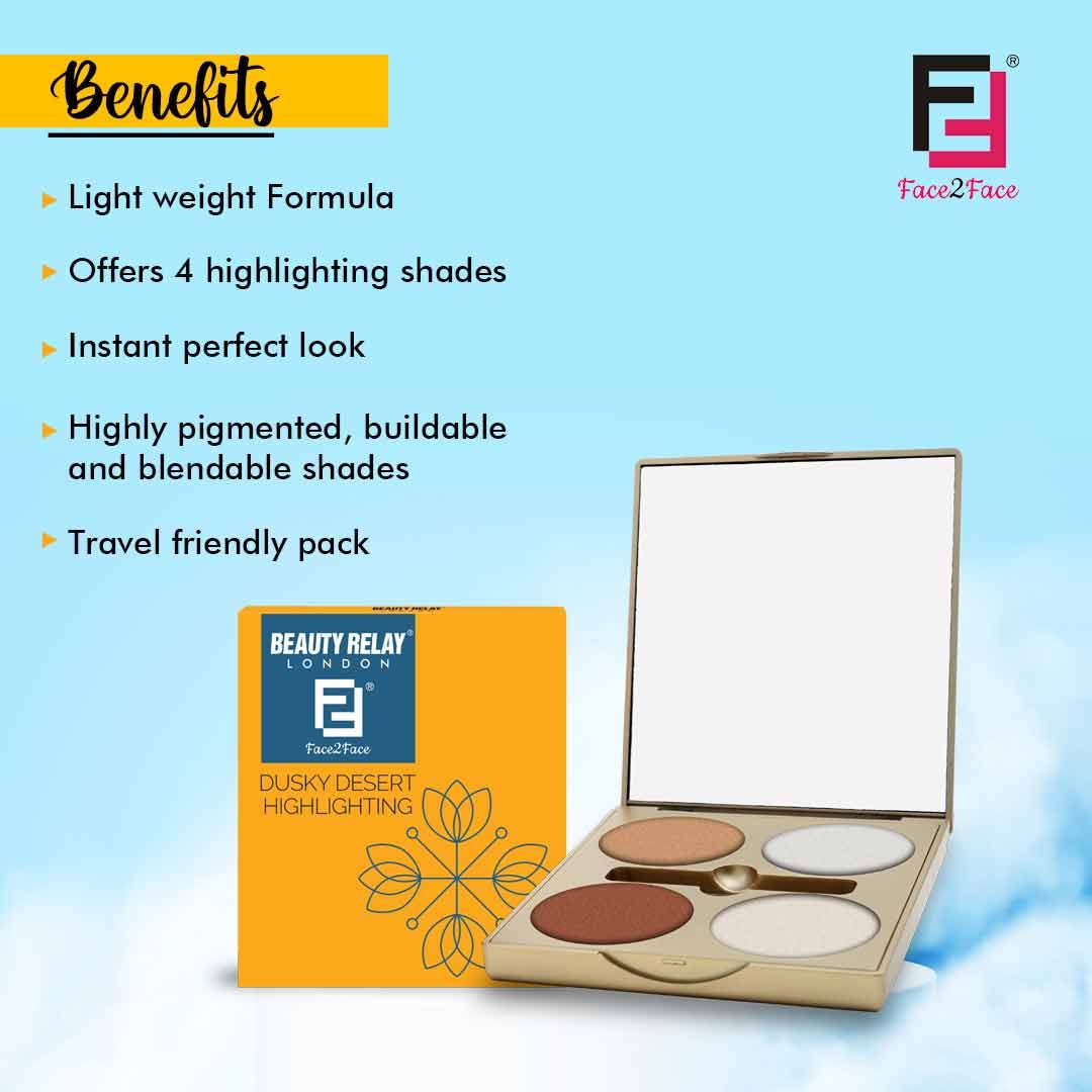BEAUTYRELAY LONDON – Face 2 Face Dusky Desert Highlighting Palette – 4 in 1, multitasking highlighter, lightweight, With Vitamin-E, illusion, brightness – Long-lasting, with 4 shades
