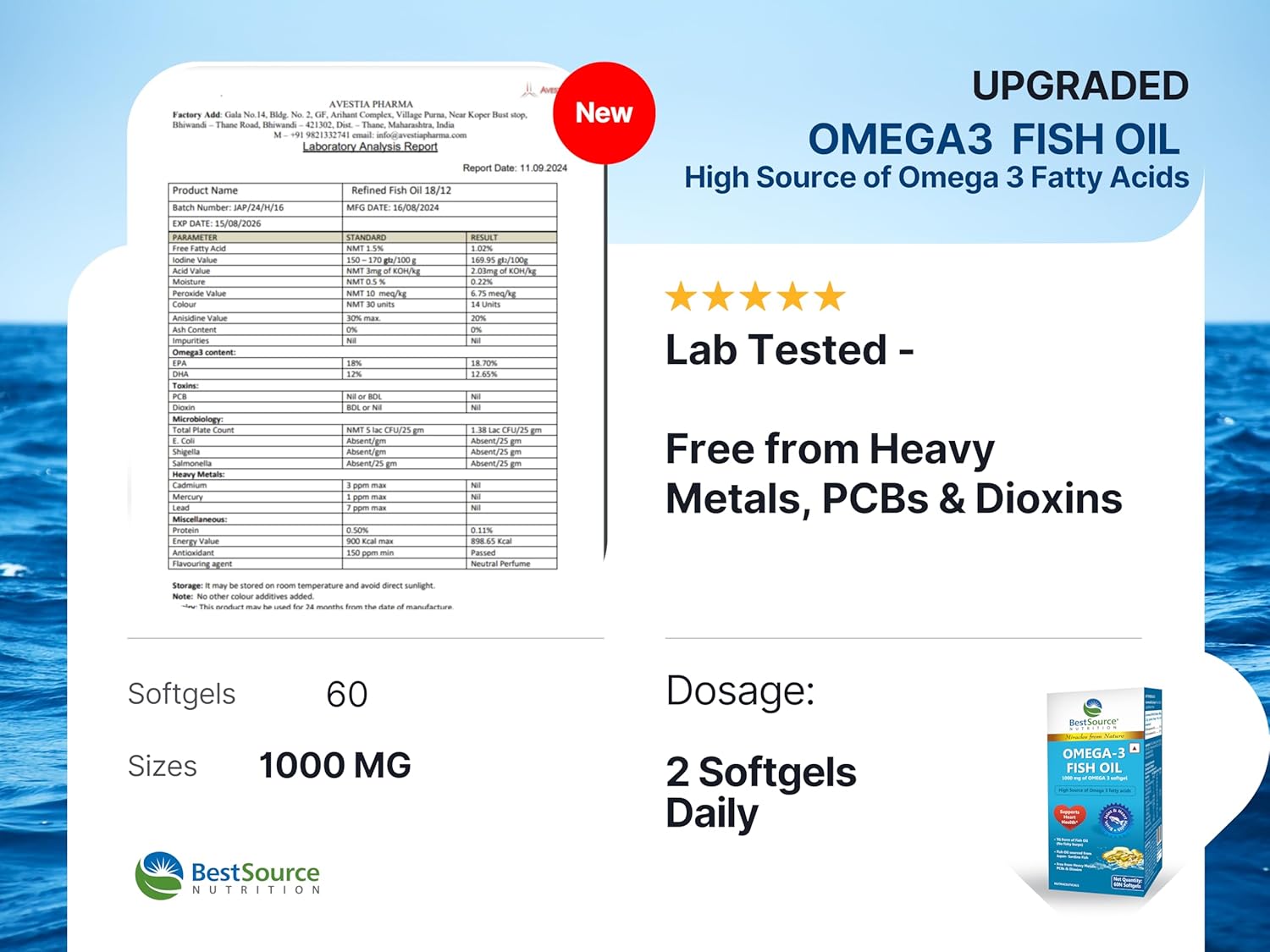BestSource Omega 3 Fish Oil,(Upgraded EPA & DHA), 1000mg of Omega 3 capsule for healthy lipid profile, Free from Heavy Metals, PCBs, & Dioxins, No fishy smell, No burping, 60 softgels
