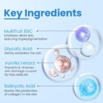 Glycolic Acid- Chemical exfoliator that removes dead skin to reveal fresh, bright skin.Salicylic Acid- Anti-inflammatory agent. Removes excess oil, clears pores & reduces acne.Multifruit BSC- An exfoliator. Removes dead skin layer, and hyperpigmentation minimizes skin scars and promotes cell renewal.