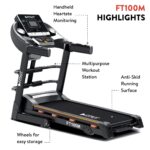 It is equipped with a powerful 1.75HP (Continuous) and 3.25HP (Peak) efficient DC Motor, 3 level manual inclination, Manual Lubrication for easy maintenance , a Speed Range of 0.8-14.8 km/hr, 1240*420 mm Wide Spacious anti-skid running board and can also be folded when not in use.It comes with a massager. LCD display showing speed, time, distance, calories burned and heart rate monitoring via heart rate sensor. It also comes with a safety key.