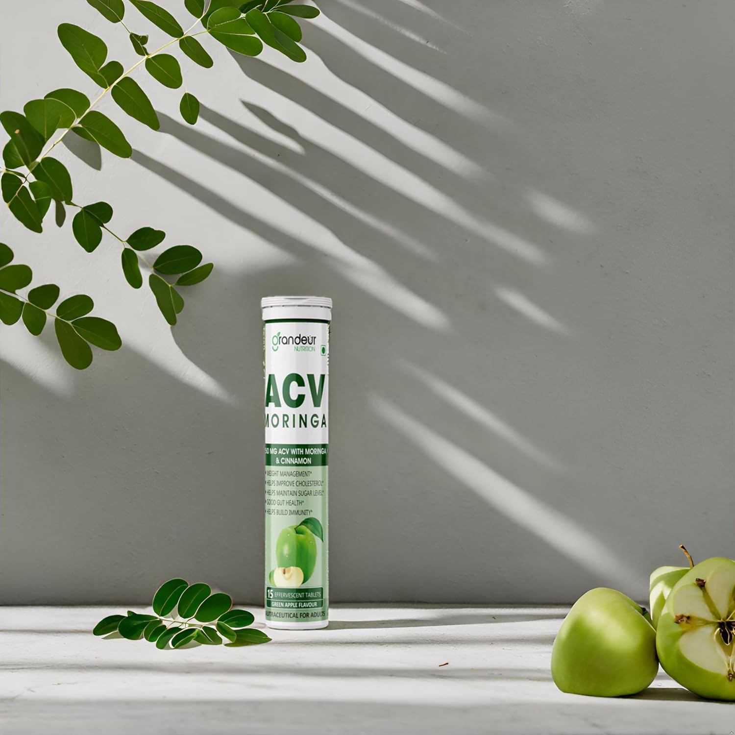 Grandeur Plant Based ACV Moringa, 30 Apple Cider Vinegar Tablets For Weight Management 750mg, With Cinnamon | Controls Cravings | No Added Sugar | Natural Energy Booster | Healthy Gut | Green Apple