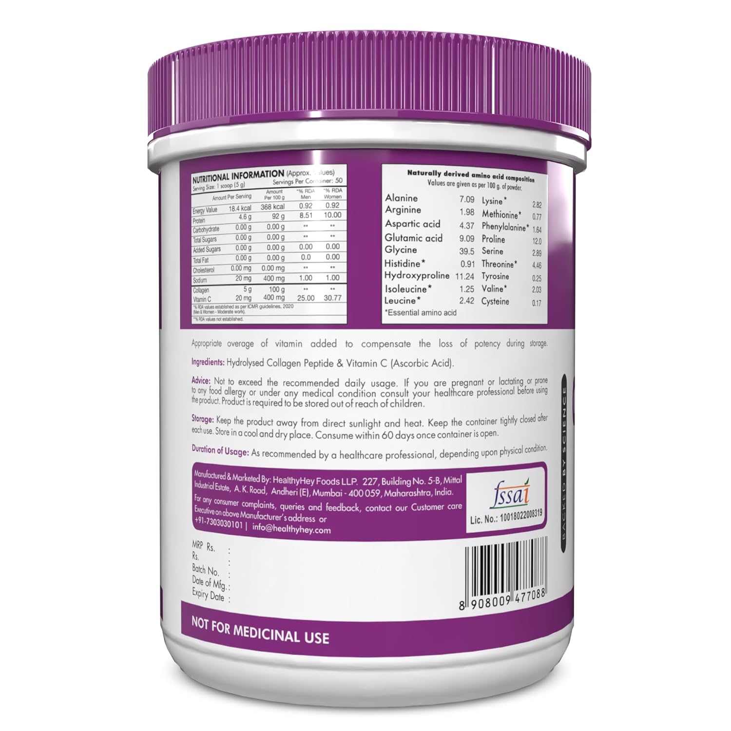 DIGESTIBLE AND BIOAVAILABLE: Unlike native collagen, HealthyHey Pure Hydrolysed Collagen supplement is highly digestible and bioavailable. Studies have demonstrated that over 90% of Collagen Peptides are digested and available in connective tissues within a few hours of ingestion. This rapid availability ensures the effective delivery of essential peptides and amino acids to the body.