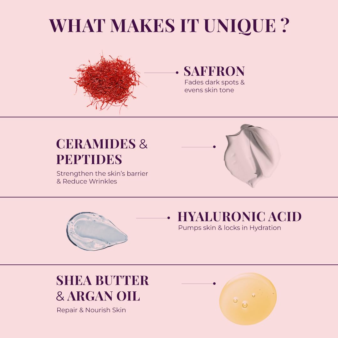 Inspired by Ayurveda & Modern Science: Kesara Illume blends ancient beauty rituals with advanced skincare.Key Ingredients: Saffron, Peptides, Hyaluronic Acid, and Ceramides for multi-targeted care.Multi-Functional Formula: Hydrates, firms, brightens, and protects—all in one cream.Simplifies Your Routine: Why use multiple products when Kesara Illume does it all?Time-Tested & Cutting-Edge: Combines Saffron’s natural glow-enhancing properties with modern actives like Peptides and Ceramides.Luxurious & Effective: Perfect for those who value time, quality, and visible results.Indulge in Kesara Illume: Your go-to for youthful, radiant, and well-protected skin.