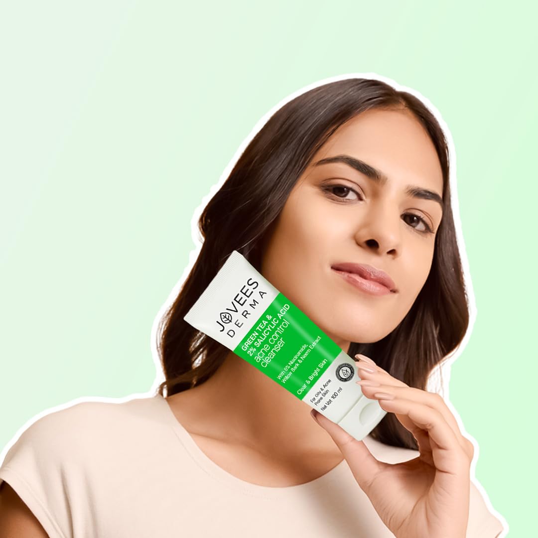 Jovees Derma Green Tea & 2% Salicylic Acid Acne Control Cleanser is meticulously formulated to target acne and enhance skin clarity. Infused with 5% Niacinamide to brighten and even skin tone, and natural Willow Bark and Neem extracts for their antibacterial properties, this gentle cleanser effectively removes impurities without stripping the skin. It helps to unclog pores, reduce blemishes, and prevent future breakouts. With the added benefits of soothing Aloe Vera and antioxidant-rich Green Tea, your skin will feel refreshed, clear, and healthy after every wash.