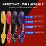 4 Resistance Bands Levels: Pull up assist bands come in 4 resistance levels, and each color is different resistance and width for different purposes. Red:15-35 lbs., Black:25-65 lbs., Purple:35-85 lbs., Green:50-125 lbs.