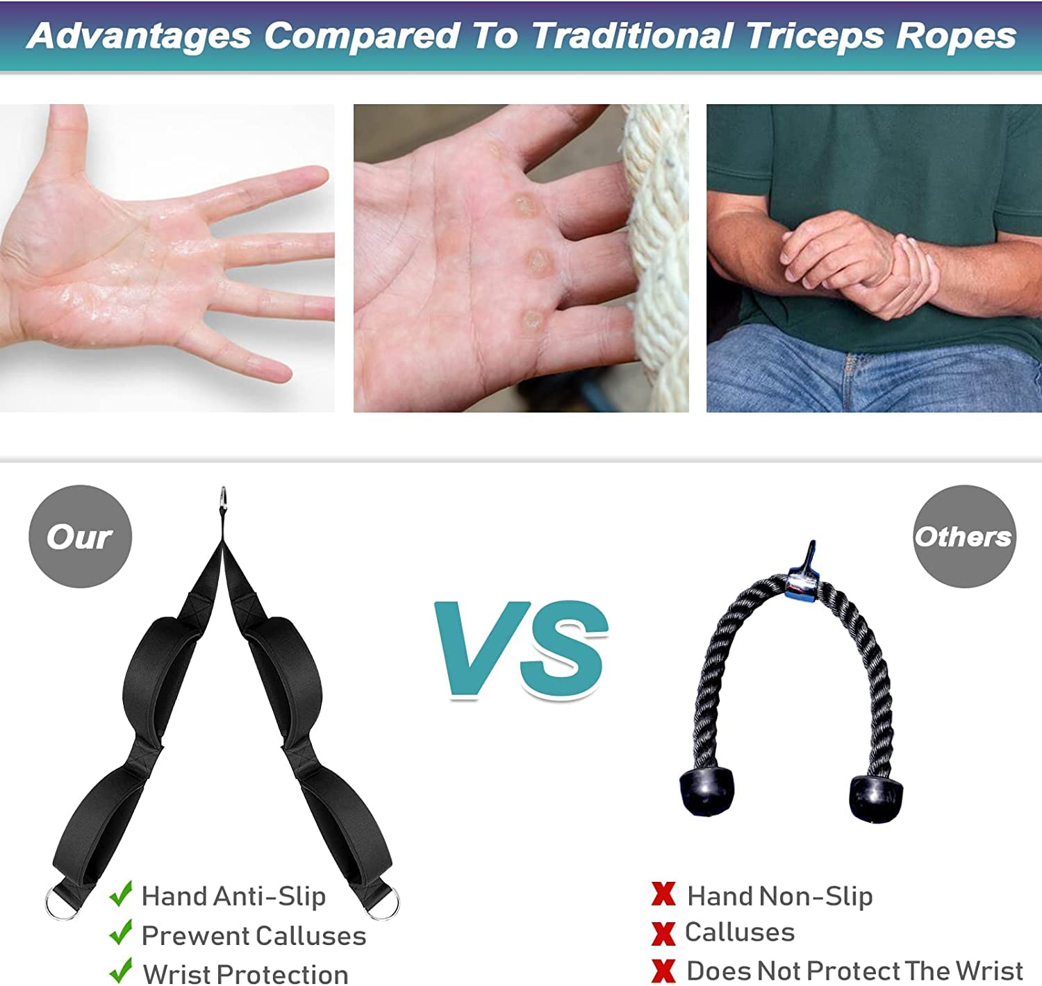 🔥 2 Sets of Anti-Slip Neoprene Handles: The tricep fitness rope comes with 2 sets of anti-slip neoprene handles, providing a comfortable and secure grip during your workout. 🔥