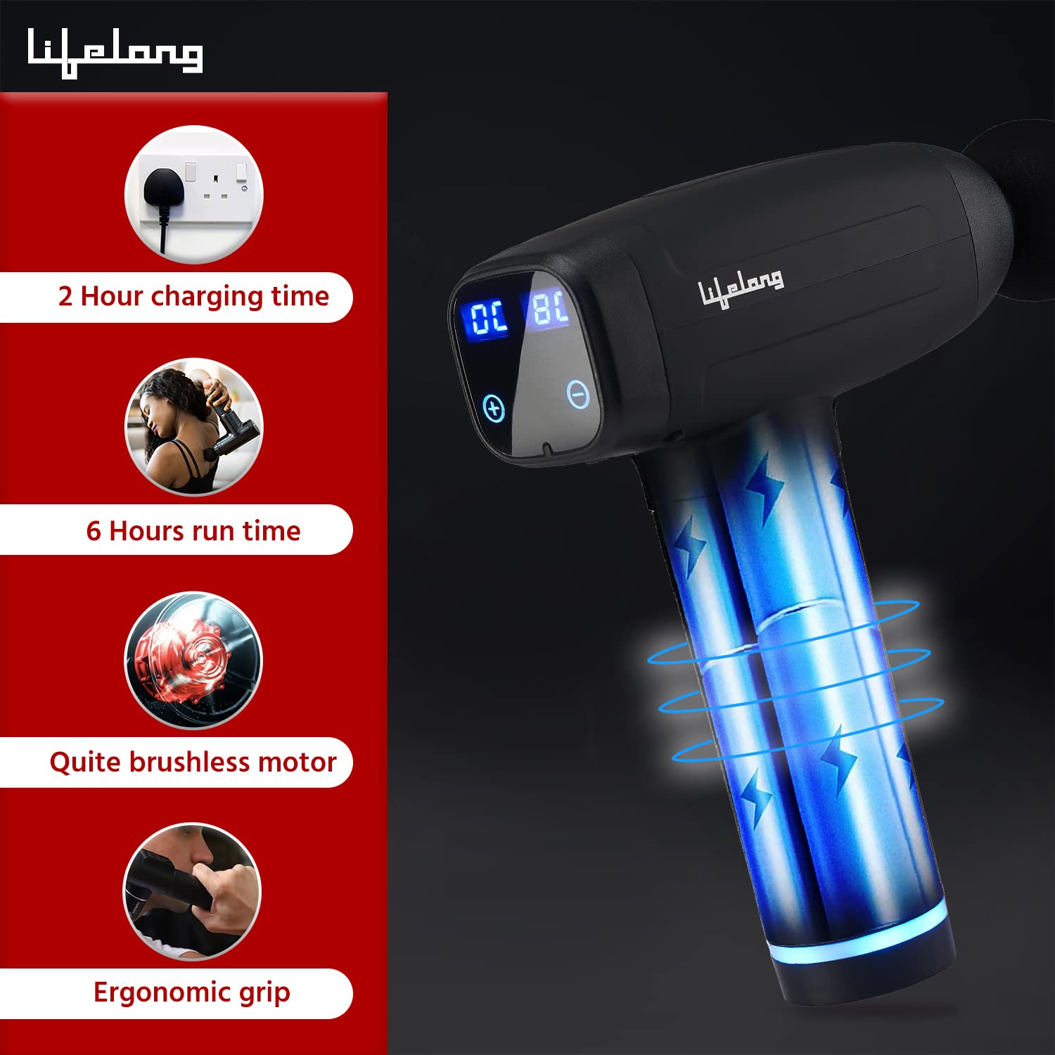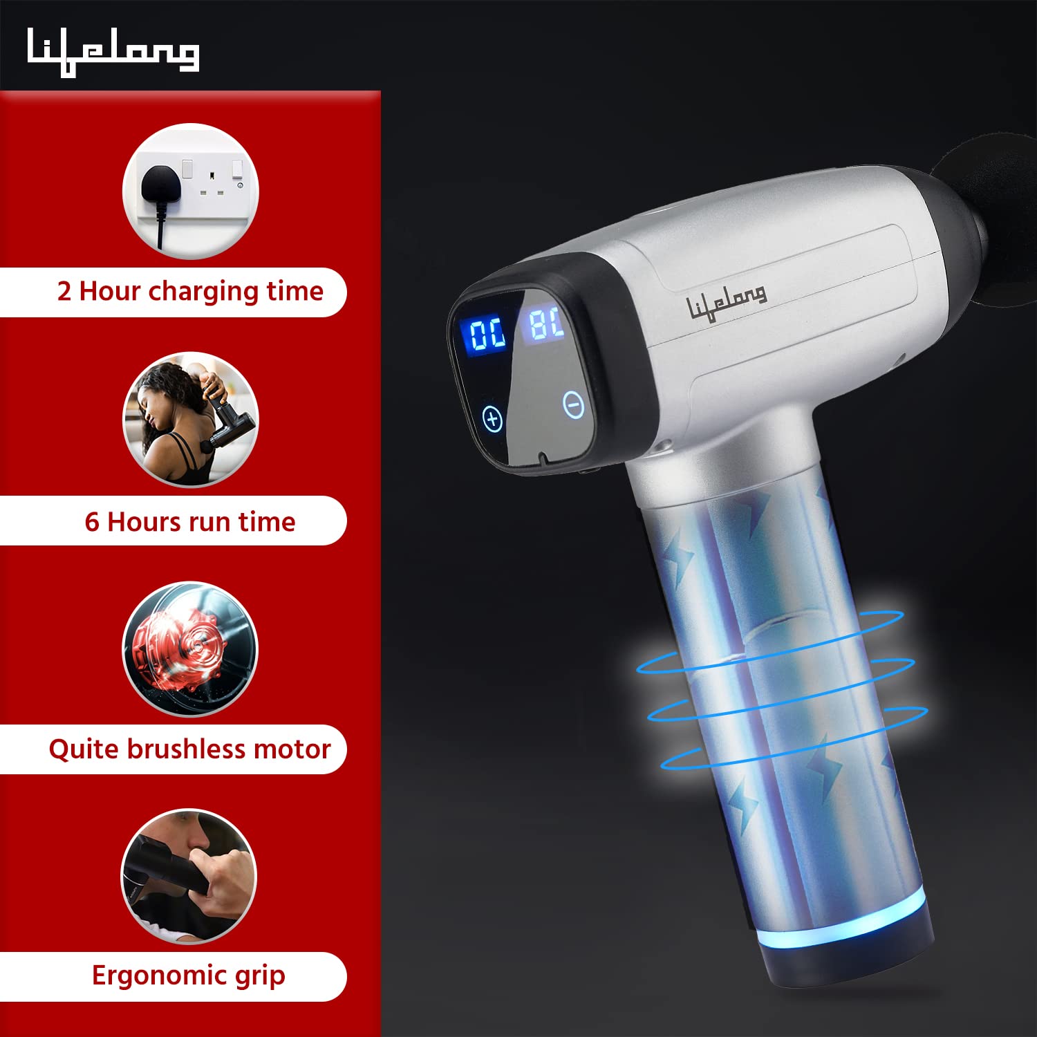 The Lifelong Massager Gun comes with a powerful 2500 mAH Rechargeable Lithium-Ion Battery which can last up to 6 hours, with 2 hours of charging.