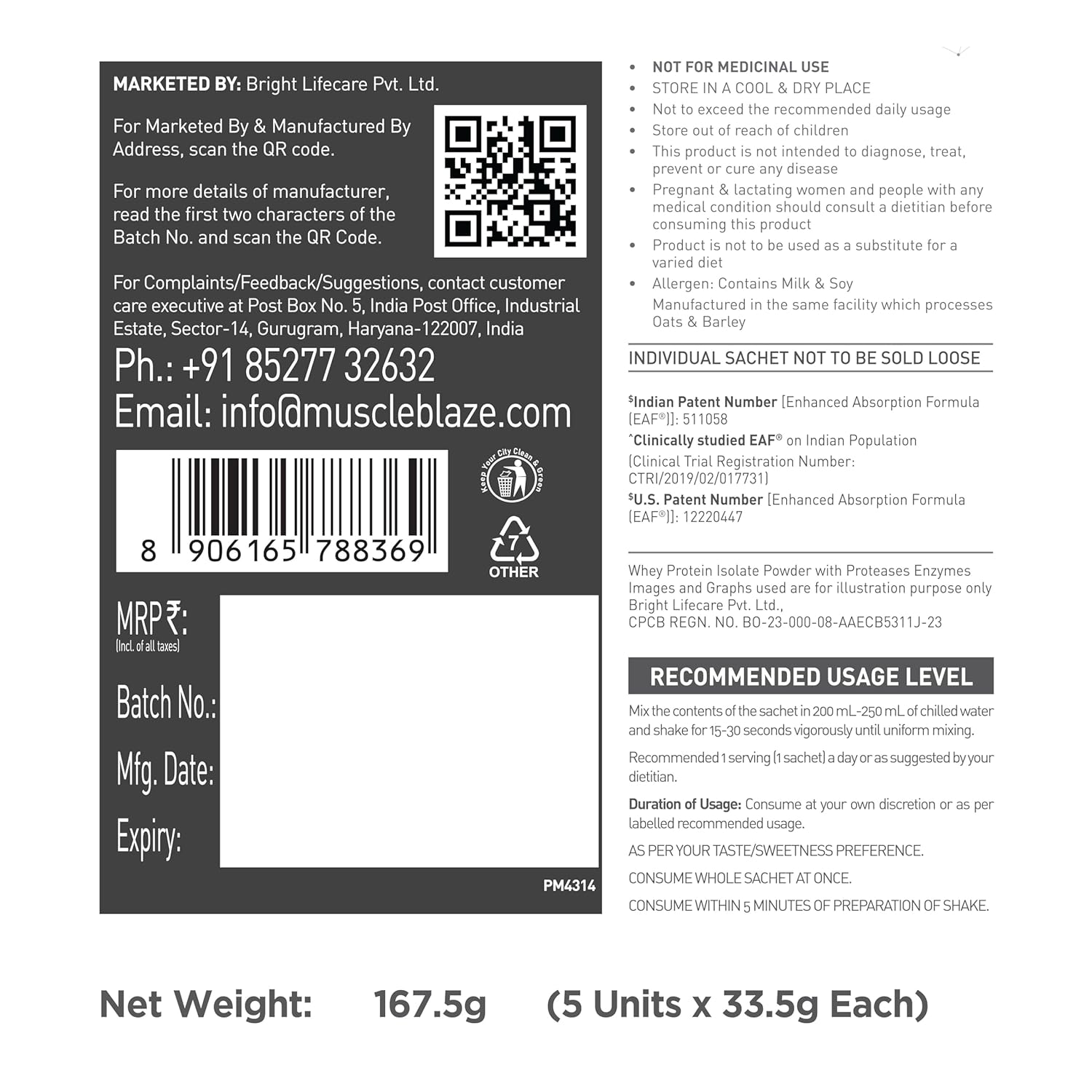 ENHANCED ABSORPTION FORMULA (EAF ): This isolate whey protein ensures 50% higher protein absorption compared to other whey proteins. This proprietary formulation of MB is U.S. patent-published & lowers any possible protein-digestion issues