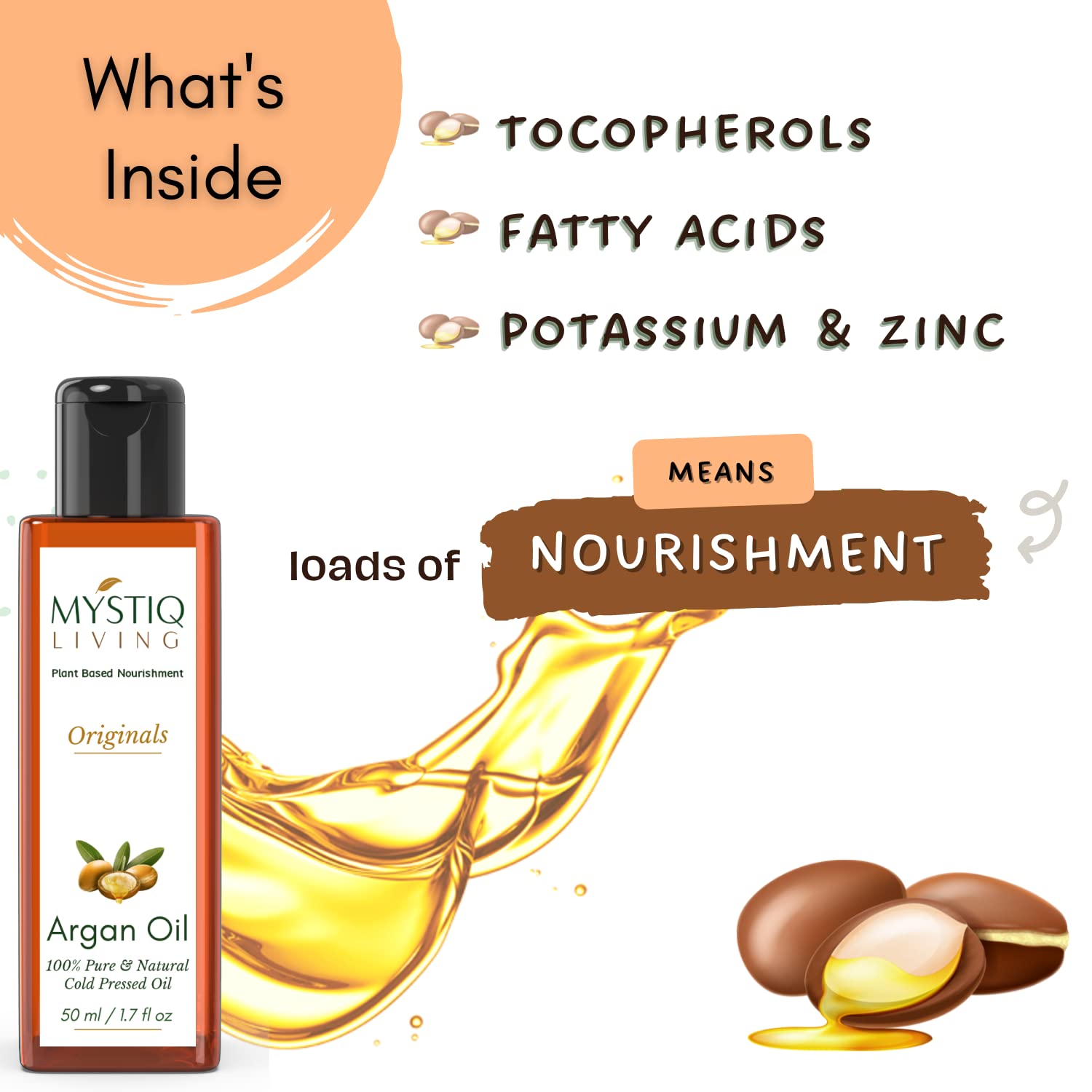 Mystiq Living Pure Moroccan Argan Oil for Hair Growth, Face, Skin, Hair Serum, Moisturizing – 50 ML | Cold Pressed, 100% Pure & Natural