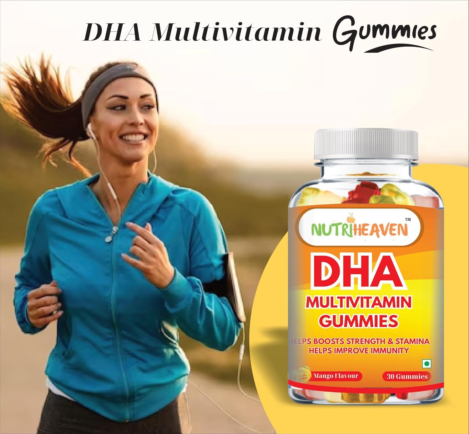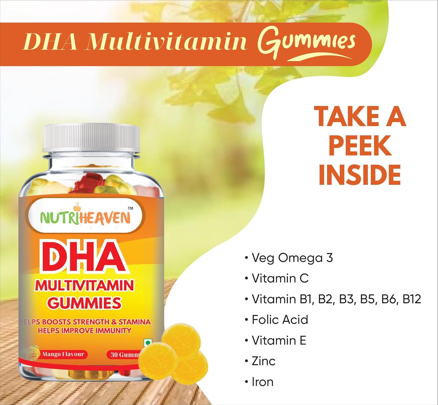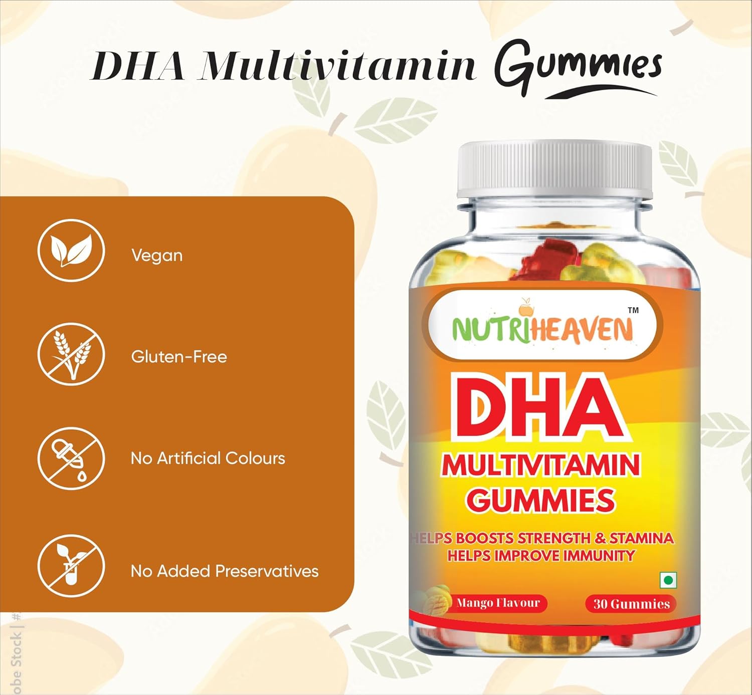 NUTRI HEAVEN DHA Multivitamin Gummies for Adult,Mango Flavour, Veg Omego 3, vitamin C, Folic Acid, Zinc, Iron, Vitamins For Healthy Growth Pack-Of-1