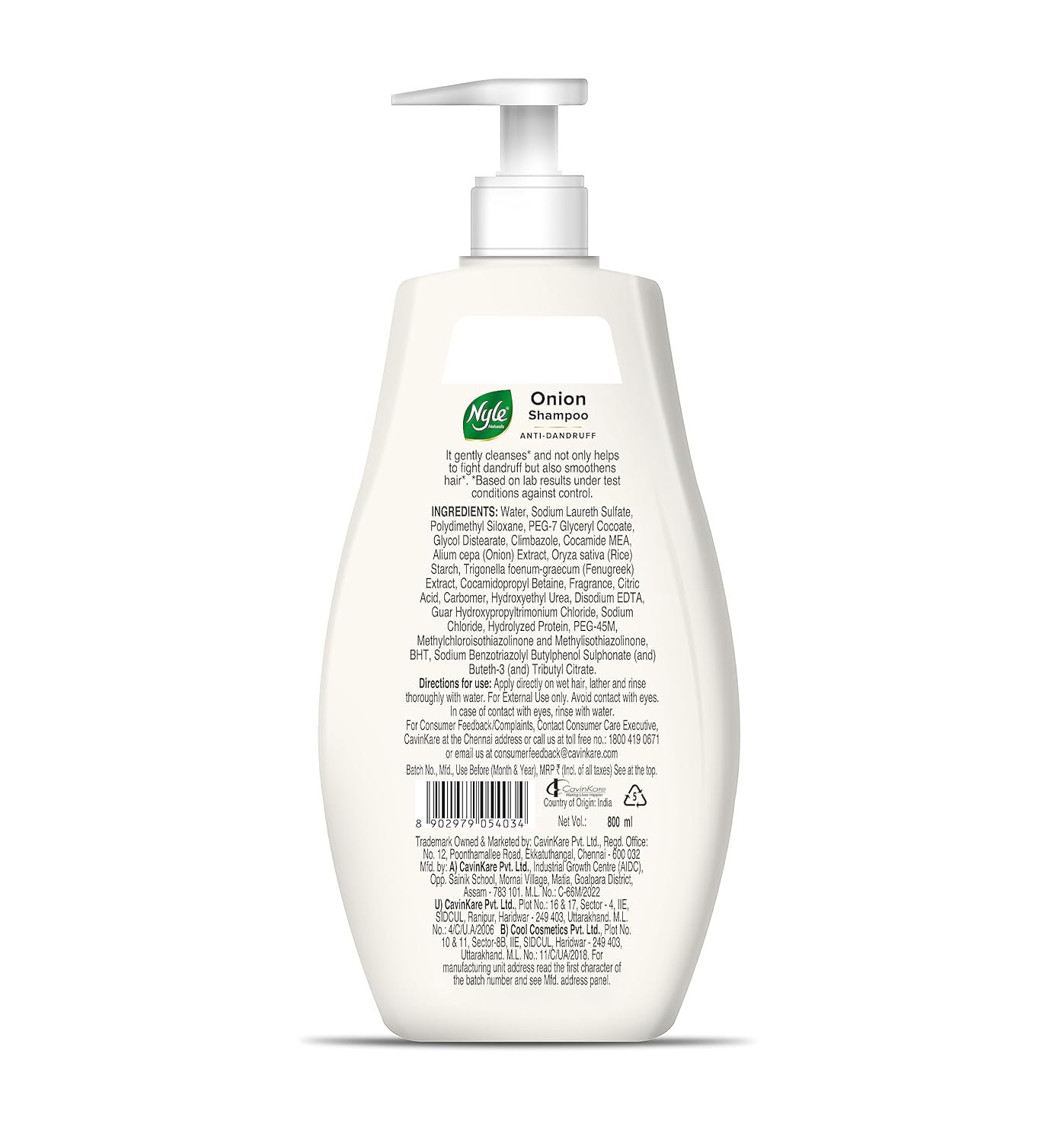 Nyle Naturals Onion Anti-Dandruff Shampoo, With Onion and Fenugreek, Gentle & Soft Shampoo, pH Balanced and Paraben Free, For Men and Women, 800ml