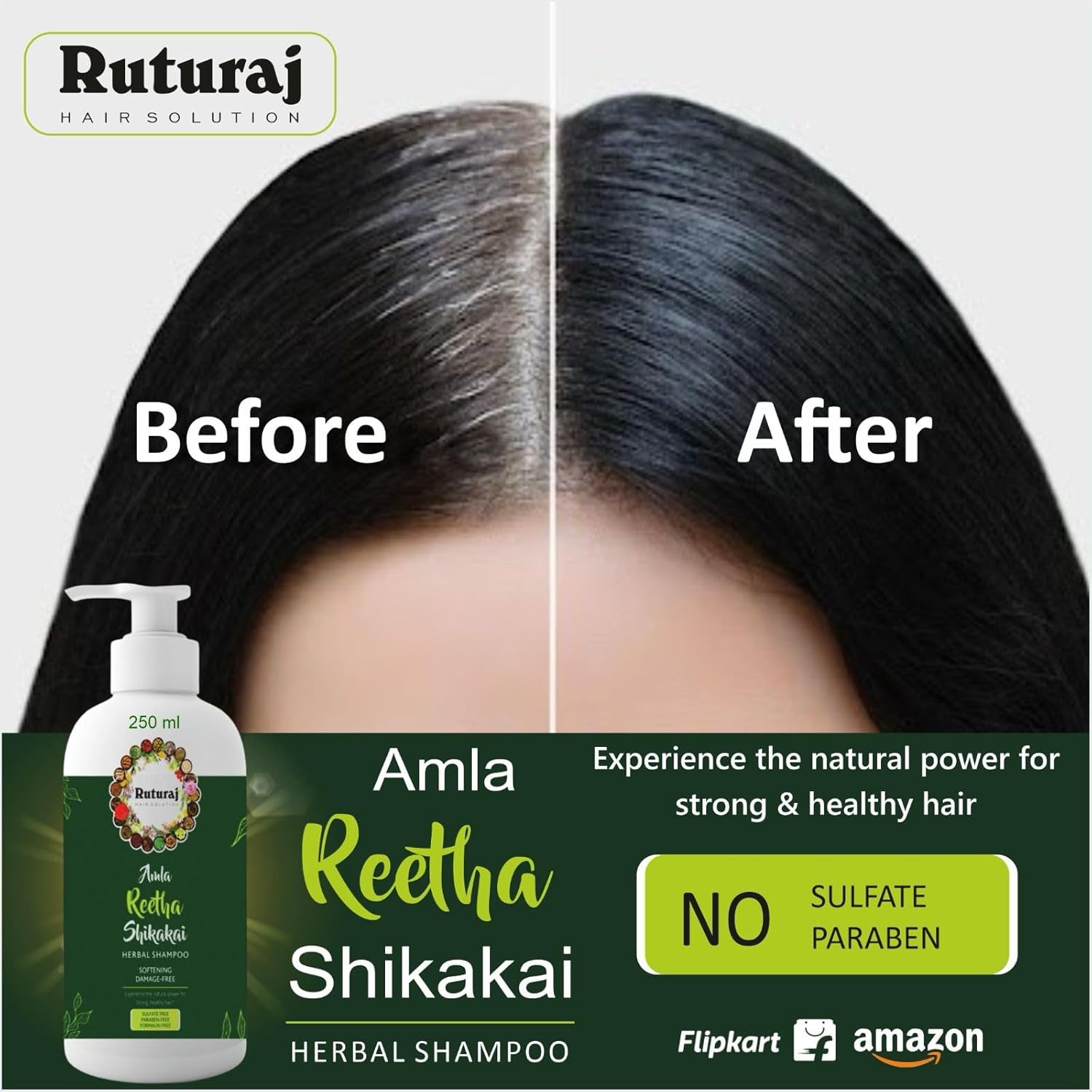 Strengthening Shampoo: RUTURAJ Amla ,Reetha & Shikaakai Herbal Hair Shampoo contains essential fatty acids, which strengthen hair follicles. The surplus of vitamin C in amla can help halt premature graying. Amla is an effective treatment for Itchy & Flaky Scalp. The Reetha makes your hair shinier and softer. This gentle hair cleanser keeps your scalp free from dandruff and prevents hair loss.
