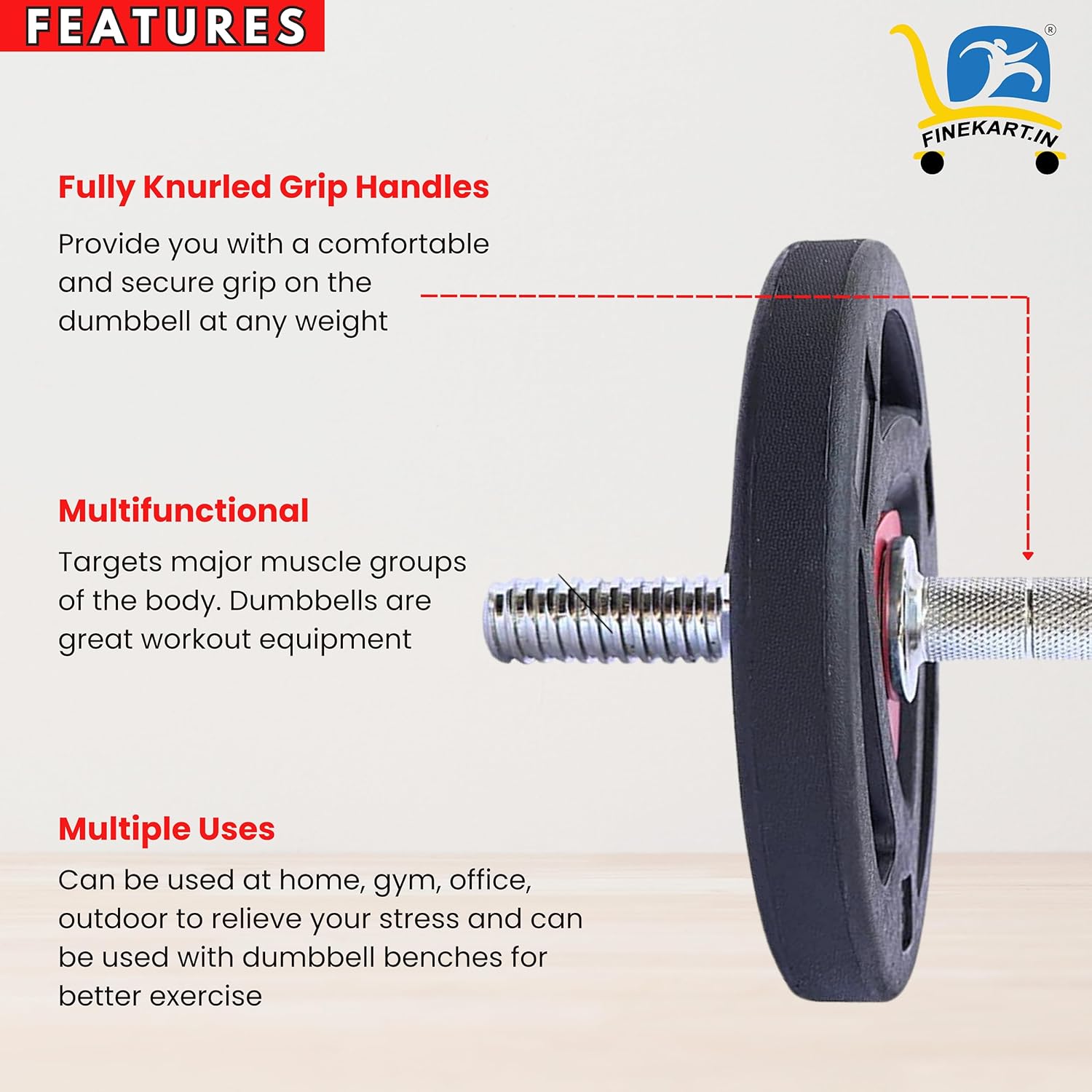 Steel Weight Plates: Customize your weight plate selection to suit your home gym setup. These weights for home gym are a great addition to your gym kit for home workouts. Elevate your fitness journey today. Space-Saving Design: While comprehensive, this set is designed to fit well in most home gym spaces, allowing you to make the most of your available room. Variety of Equipments: This set includes everything you need for a full-body workout, from weight plates and barbell to dumbbells, skipping rope, Hand Gripper, Gloves and more.