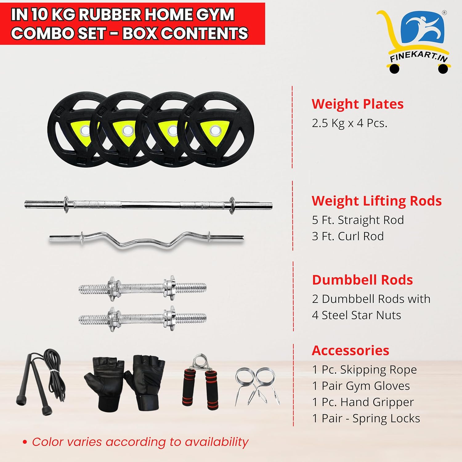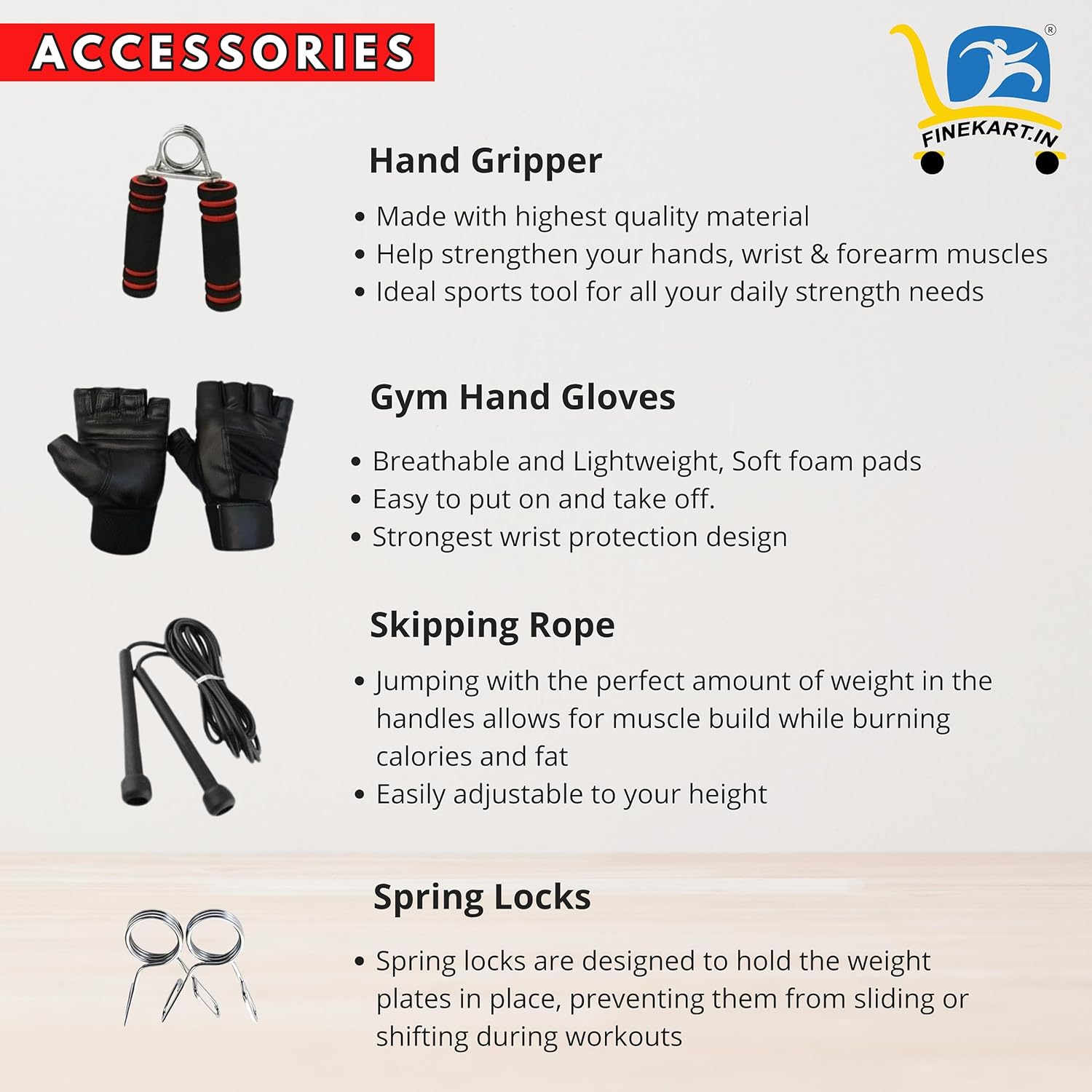 Variety of Equipments: This set includes everything you need for a full-body workout, from weight plates and barbell to dumbbells, skipping rope, Hand Gripper, Gloves and more.