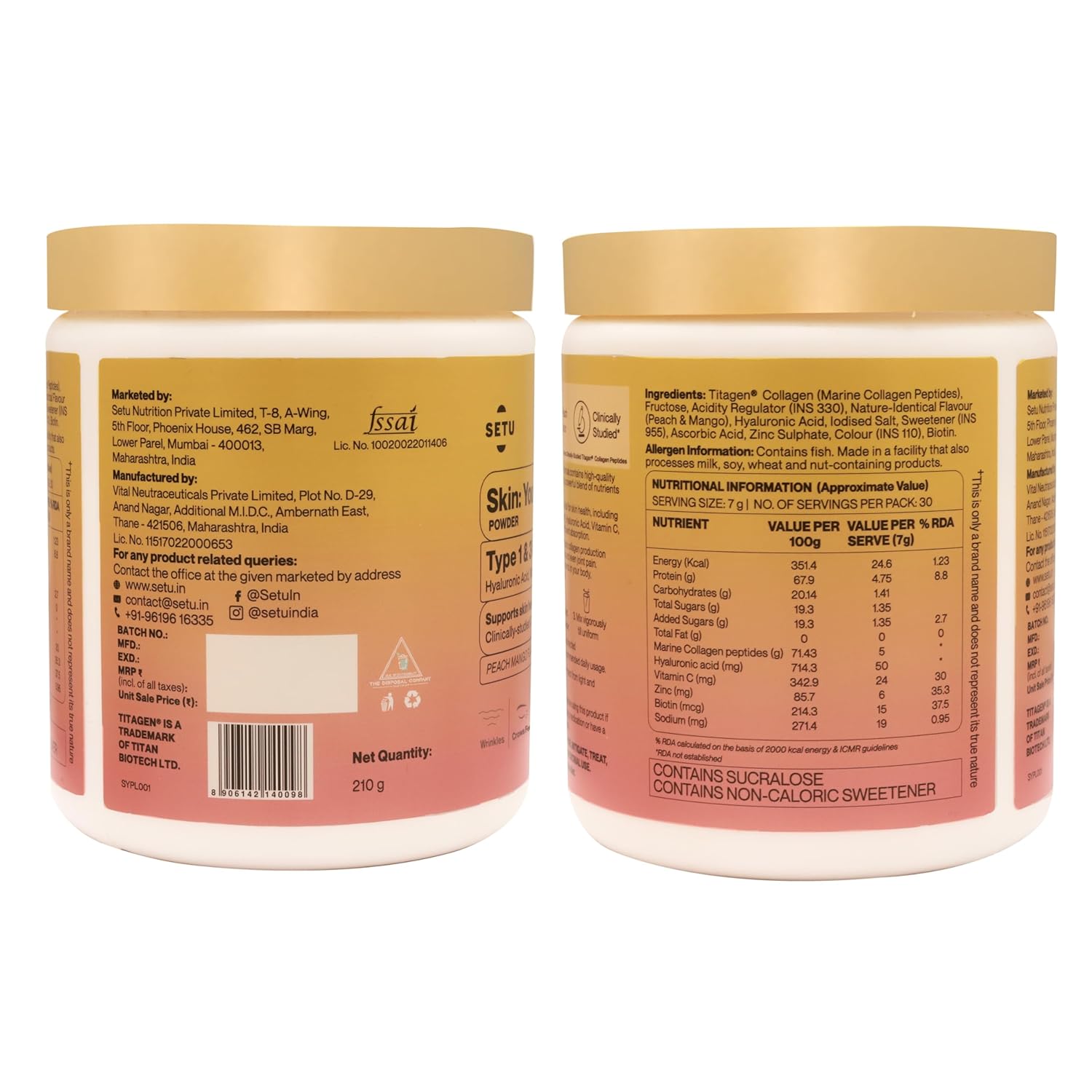 Setu Skin: Youthful Marine Collagen Powder|Hydrolyzed Type 1 & 3 Collagen Supplement for Women & Men|Supports Healthy Skin,Hair & Nails|Peach Mango Flavor|210 grams x 1