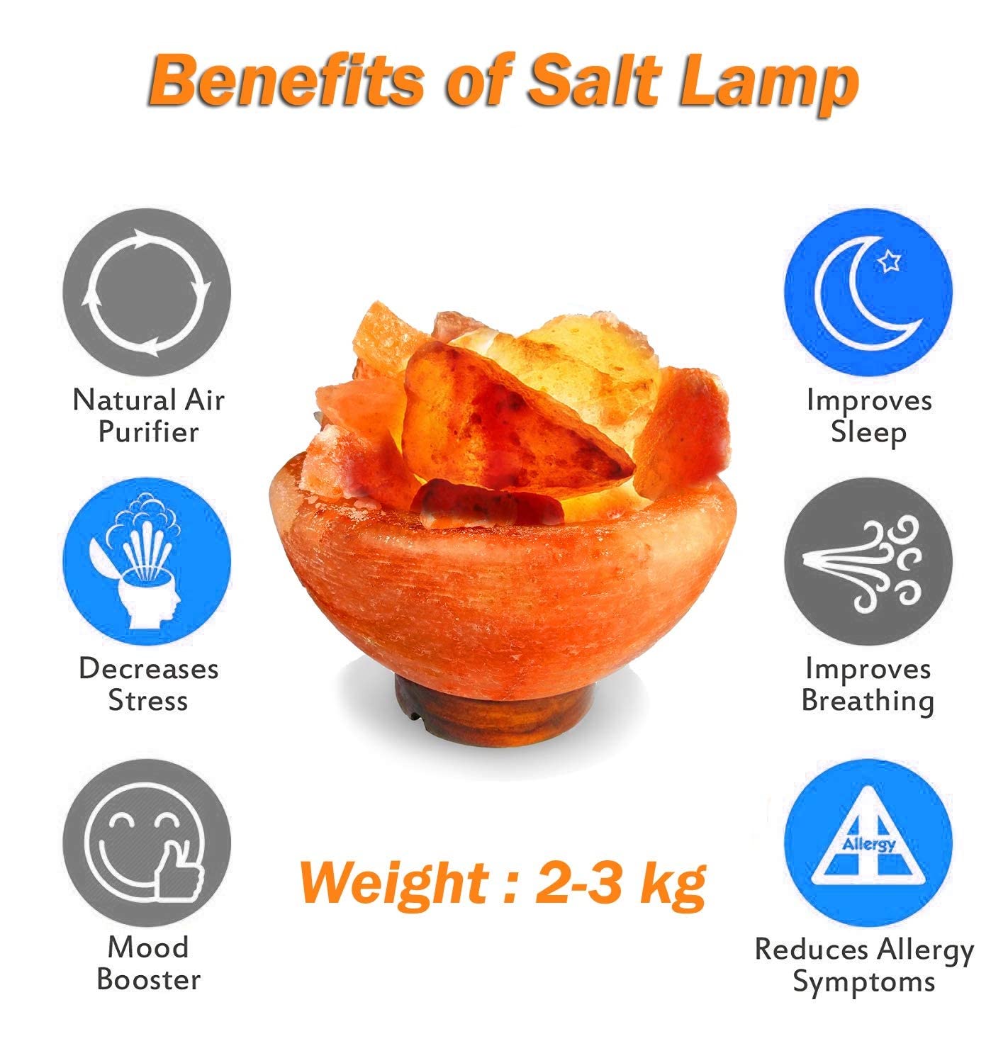 BENEFITS OF A SALT LAMP: Keeping a salt lamp in your bedroom promotes sound sleep. Purifies & Deodorizes the Air. Neutralizes Electromagnetic Radiation.