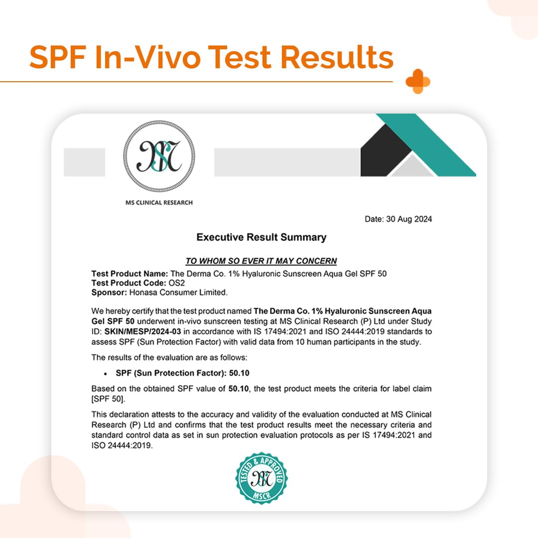 NON-GREASY & FRAGRANCE-FREE: Say goodbye to the greasy and oily finish of typical sunscreens. The Derma Co. 1% Hyaluronic Sunscreen Aqua Gel is fragrance-free and doesn’t clog your pores. The presence of 1% concentration of Hyaluronic Acid in this sunscreen makes it quick to absorb and provides intense hydration to the skin. Extremely lightweight in nature, the sunscreen dissolves like water, hence the name ‘Aqua Gel’.