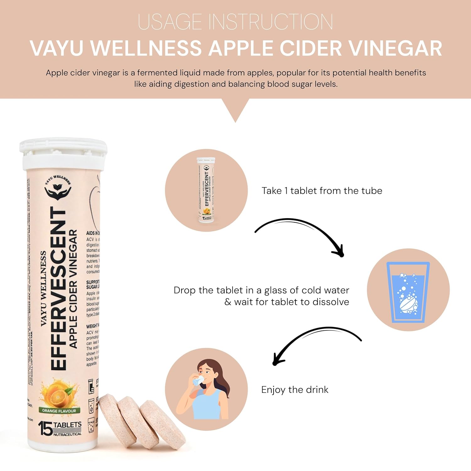 Vayu Wellness Effervescent Apple Cider Vinegar Tablets – Refreshing Apple Flavor for Digestive Support & Wellness Discover the benefits of Vayu Wellness Effervescent Apple Cider Vinegar Tablets, a flavorful and convenient way to enhance digestion, support weight management, and boost overall wellness. Formulated with 500mg of Apple Cider Vinegar, Pomegranate Extract, and essential vitamins, these tablets dissolve quickly to create a refreshing apple-flavored drink.Effervescent tablets made with natural ingredient extracts which takes 2 to 3 minutes to fully dissolve, ensuring a quality, natural solution for your needs.