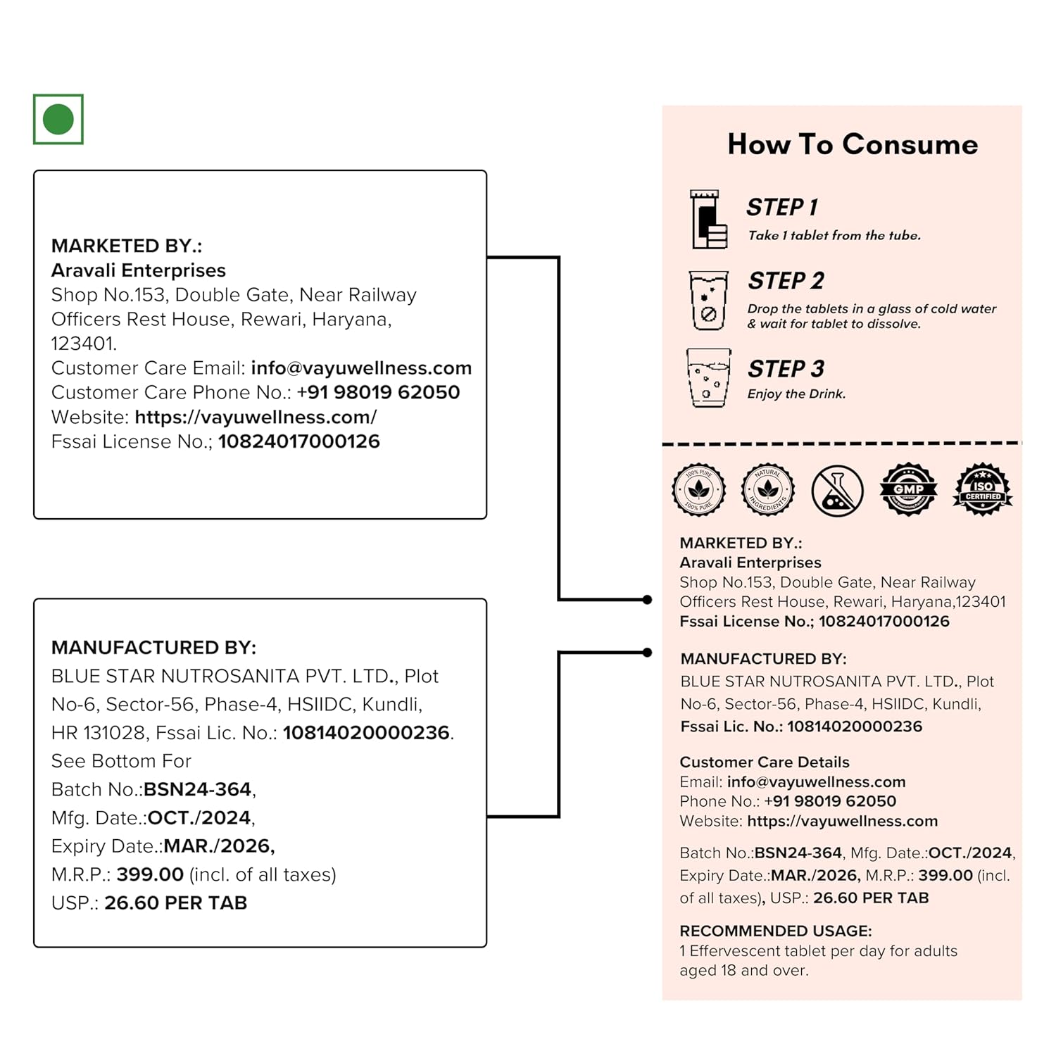 Packer ‏ : ‎ ARAVALI ENTERPRISES SHOP NO 153, DOUBLE FATAK, NEAR RAILWAY OFFICER RESTHOUSE, REWARI – 123401 , Customer Support Contact:- +91 9801962050 Email:- info@vayuwellness.com
